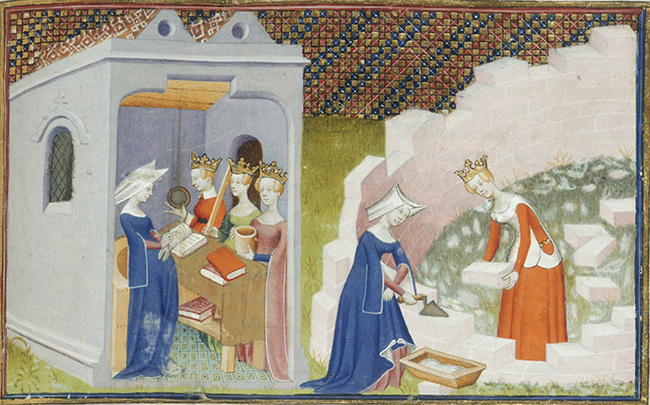 Master of the Cite des Dames. Detail of a Miniature of Christine de Pizan before the Personifications of Rectitude, Reason, and Justice in Her Study, and Helping Another Lady to Build the “Cité Des Dames.” ca 1405. Pigments and gold/silver leaf on vellum parchment. (Library of Congress).