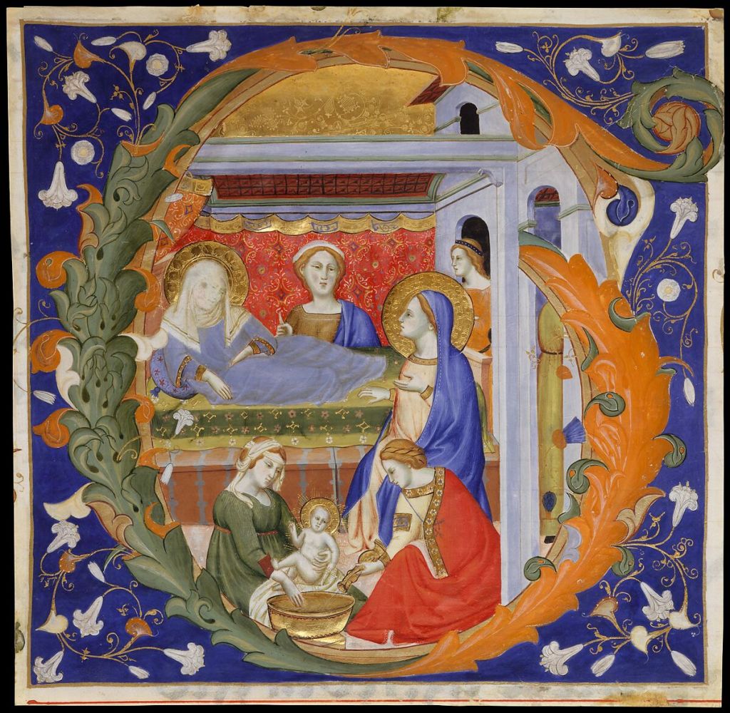 Don Silvestro de’ Gherarducci. Manuscript Illumination with the Birth of the Virgin in an Inital G, from a Gradual. ca 1375. Tempera, ink, and gold on parchment, 11 1/2 x 11 3/4 in. (The Met Collection).